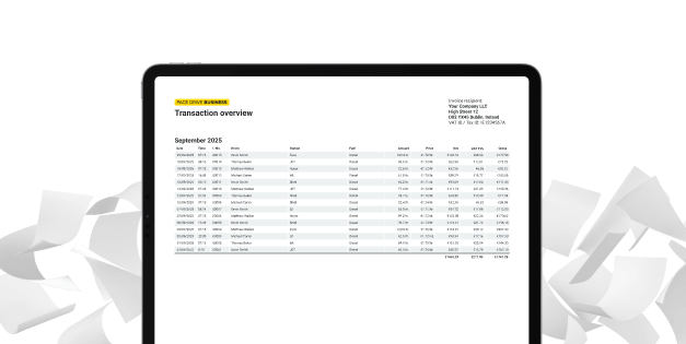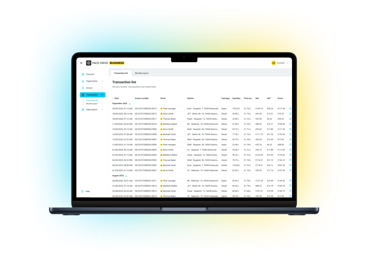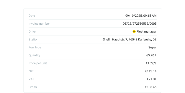 Get a real-time overview of all fueling transactions in the transaction list and filter them by driver, vehicle, or time period. You can export all data as a PDF for billing purposes. With the Fleet+ plan, invoices are also available in ZUGFeRD format for seamless digital processing.