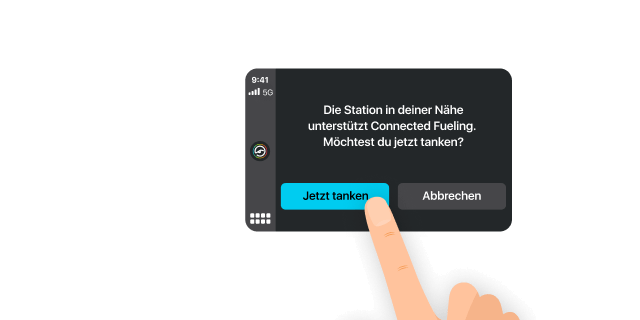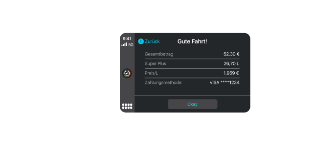Alle wichtigen Informationen, von der Tankstellensuche bis zur Zahlungsbestätigung, werden klar und übersichtlich auf deinem Auto-Display dargestellt.